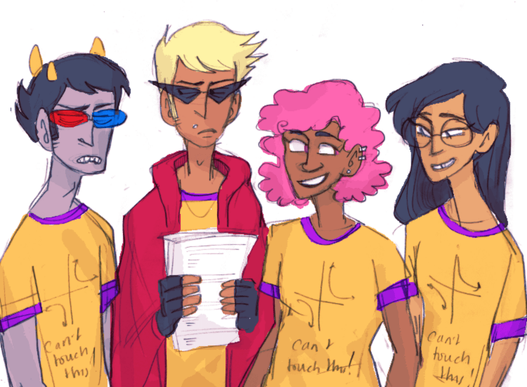 roxy is the president friendleader, dirk is the scary vp who throws practice tests at people in the hallways, jade seems harmless but is actually completely ferocious at competitions, and sollux doesn’t actually want to be here
